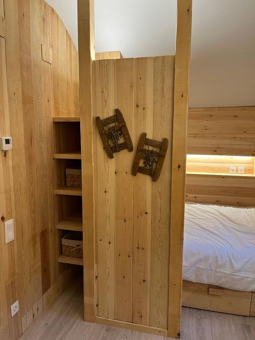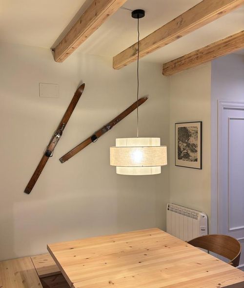 Este apartamento en Baquèira se reformó con la premisa de que predominara el ambiente de montaña y esquí. Para conseguirlo, se utilizó madera de pino natural y complementos decorativos, como raquetas y esquís. También se intentó optimizar el espacio dando uso a cualquier hueco aprovechable. Además, el color blanco combinado con la madera proporcionan un ambiente de montaña sin sobrecargar las estancias.